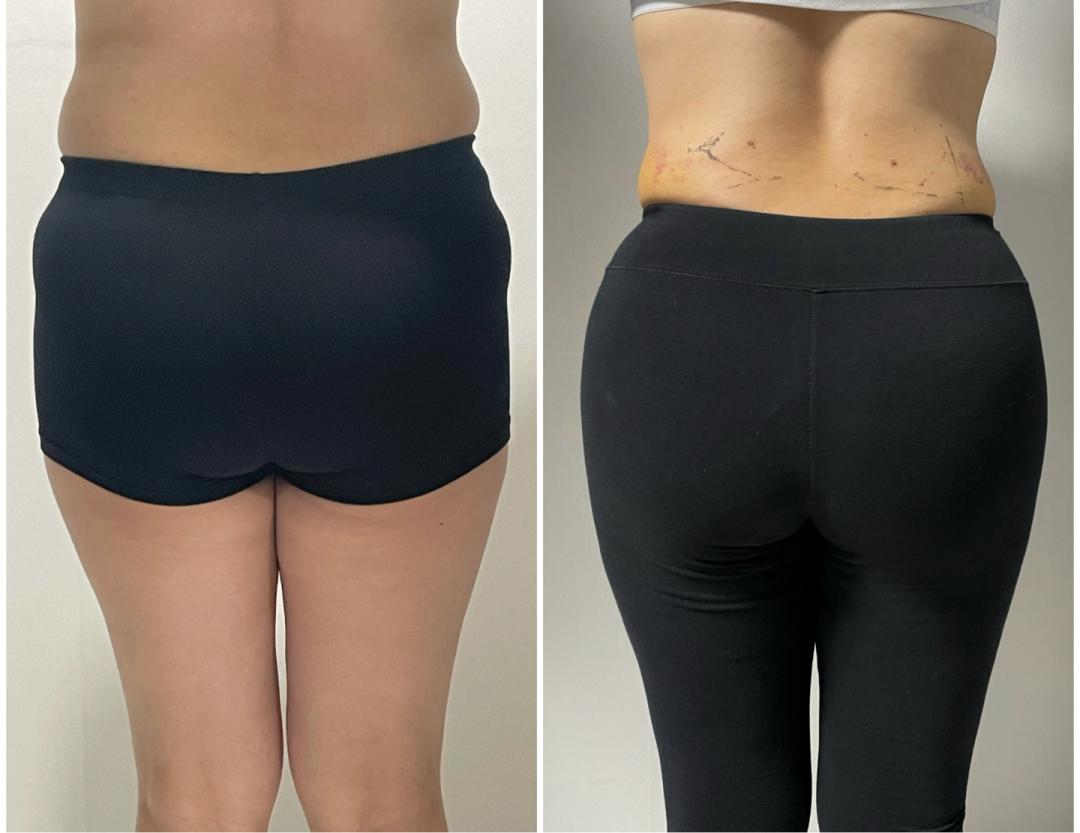 진단은 핀치 테스트와 초음파 검사를 통해 이루어졌습니다. 수술계획에는 골반이식, 지방흡입, 사후관리 등이 포함됐다. 3. 복부 및 러브핸들 지방흡입과 골반이식 수술 후 총 6,210cc의 변화된 지방을 흡입하였습니다. 골반이식은 양쪽에 230cc씩 시행하였습니다.