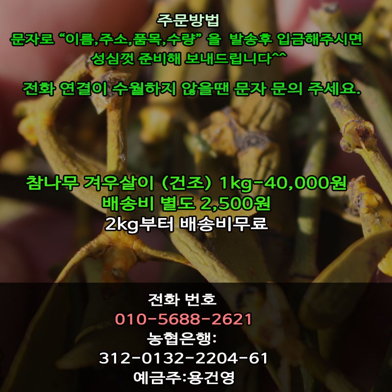 겨우살이 효능 2. 인슐린 분비를 정상화하고 그에 상응하는 수준을 정상화하는 당뇨병의 기능. 당뇨병 환자 외에도 예방을 위해 겨우살이를 섭취할 수도 있습니다. 사실 당뇨병은 주로 식이요법으로 조절하는데 합리적인 식이요법이 없으면 당뇨병 발병률이 매우 높은데 겨우살이는 이런 당뇨병 예방에 매우 효과적이다. 겨우살이의 효능 3. 혈관건강 요즘 자극적인 음식을 많이 드시는 분들이 많습니다. 그 결과 혈중 콜레스테롤이 상승하고 노폐물이 혈액에 축적되어 관련 질병에 시달리는 사람들이 점점 늘어나고 있습니다. 겨우살이를 먹으면 이 콜레스테롤 수치를 낮추고 고혈압, 동맥경화 같은 성인병을 예방할 수 있기를 바랍니다. 겨우살이의 효능 4. 항암작용 겨우살이에는 렉신과 비스코텍신이 많이 함유되어 있다. 이러한 물질은 세포 손상과 암 성장을 방지하여 암 재발을 줄이는 것으로 알려져 있습니다. 이소플라본과 사포닌은 항암작용이 뛰어나 겨우살이는 천연 항암제로도 알려져 있다. 5. 피부 개선 겨우살이에는 항산화 물질이 함유되어 있어 피부의 염증과 노폐물 제거에 도움이 되며 해독작용이 뛰어나며 이를 억제하고 색소침착, 여드름, 기미, 주근깨 등을 예방하고 제거에도 효과적이다. 피지. 겨우살이 차 먹는 방법 – 물 2리터에 겨우살이 25g을 넣고 센 불에서 끓입니다. 관심있으신 분들은 아래 방법으로 연락주시기 바랍니다.