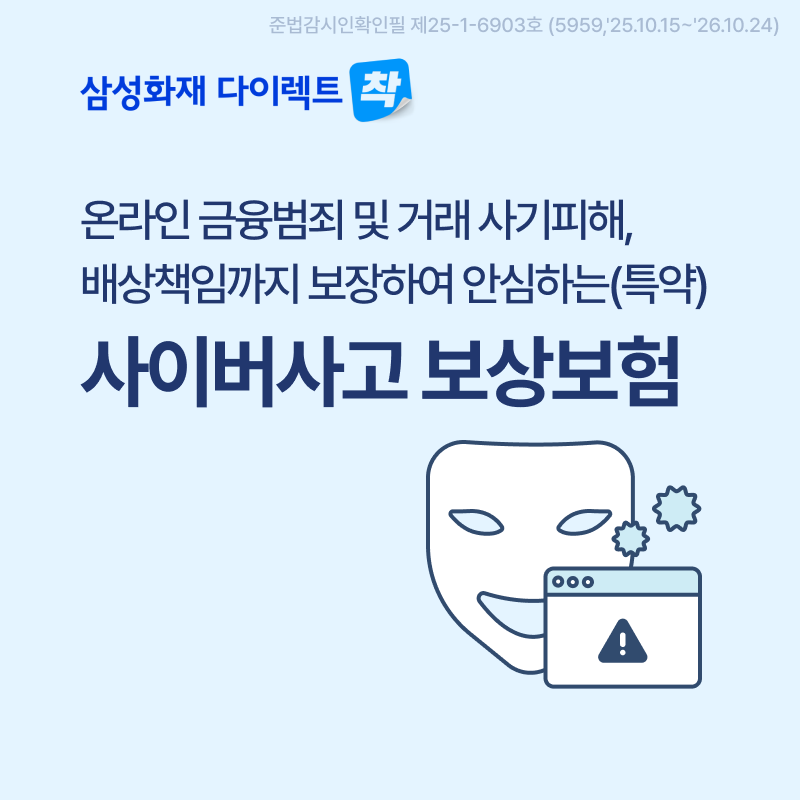 사회 환경의 급격한 변화와 디지털 경제의 비중 증가로 개인이 직면한 사이버 위험이 지속적으로 확대되고 있어 삼성화재는 일상의 사이버 위험을 보호하는 사이버 재해 보상 보험을 출시했습니다. . 【상품개요】 *보험기간 : 1년 *지급방식 : 일시불 * 참여방법 : 사이버사고(개인)/사이버사고(기업)[상품특징]특약약관(아래 특약약관에 가입 ① 사이버금융범죄 손해배상특약 ② 온라인직거래사기 손해배상 특약 └ 온라인쇼핑사기 손해배상 추가특약 ③ 책임 및 보상에 관한 특약 온라인 활동상의 법률비용은 100만원 중에서 선택 가능 플랜 또는 200만원 플랜 ① 100만원 플랜 : 인터넷 금융범죄, 온라인 직거래(쇼핑몰 포함), 온라인 배상 및 소송비용 담보당 100만원 한도(건당 총 200만원/건) 년) 거액 ② 200만원 계획 : 인터넷금융범죄, 온라인직거래(쇼핑몰 포함), 온라인 배상, 법률비용 건당 최대 200만원 배상 보장 보장(건당/년 합계) ※ 자기부담( 각 사고)는 손해액의 10%, 10% 1만원 피보험자 범위 확대 중 큰 금액 : 혼인계약 특약 또는 가족계약 특약 선택 시 피보험자의 범위는 피보험자는 본인의 가족(가족: 법적 배우자, 자녀, 부모)으로 확대 【주요 손해】 ① 인터넷 금융범죄: 피싱, 해킹 등 금융사기로 인한 예금 인출, 부정사용으로 인한 금전적 손실 ② 인터넷 직거래 사기 피해보상 : 인터넷 직거래 사기로 인한 금전손실의 경우 물품이 발송되지 않은 경우 판매자가 다른 물품을 발송한 경우 구매자가 대금을 수령하지 못한 경우 ③ 인터넷몰 사기 피해보상 : 인터넷몰 사기로 인한 사기 ④ 네트워크 활동상의 책임 및 법률비용 : 네트워크 활동상의 과실로 인한 저작권, 상표권, 상호 등의 손해에 대한 법적 책임 단, 무고죄만 가능) 출처 : 삼성화재 “보험가입 상담시간” ▼▼▼ 평일▼▼▼ 오전 6시~오전 9시 오전 10시~오후 4시 ※문의는 삼가주세요 상담시간외 상담.