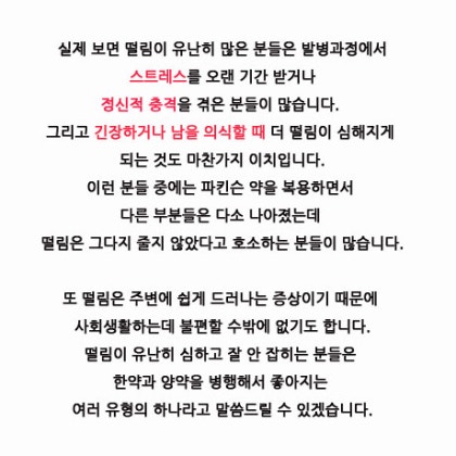 또는 복용하고 있는 약과도 상관관계가 있을 수 있습니다. 감기약이나 두통약 등에는 카페인 성분이 함유된 약이 있는데 카페인은 떨림을 유발할 수 있고 신경안정제나 우울증 약에도 떨림을 유발하는 성분이 들어 있어 복용 중인 약 때문인지 의심해야 합니다. 이런 경우에는 처방한 의사와 상담하여 복용해야 합니다.