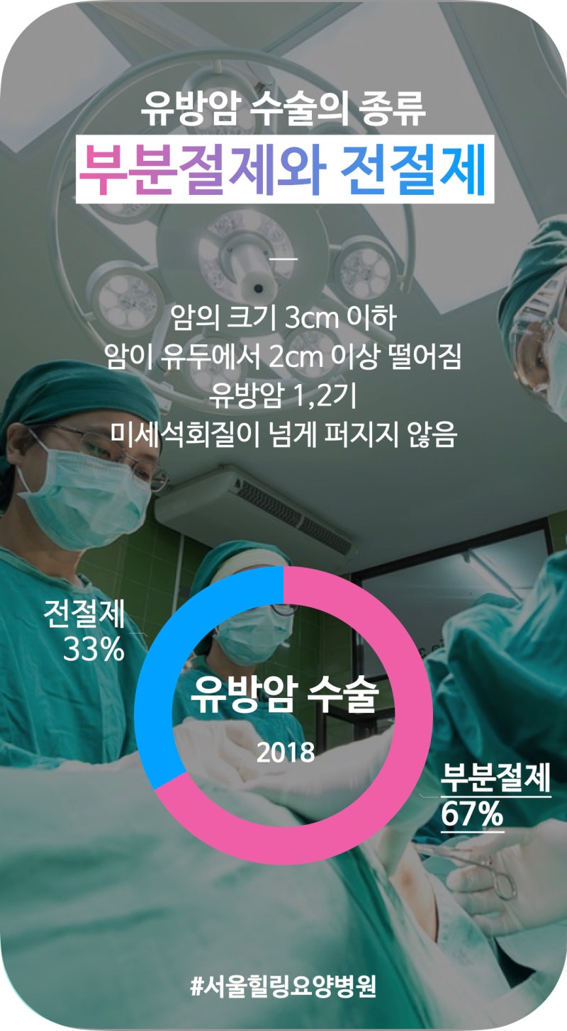 수술의 종류는 유방을 모두 제거하는 전절제술과 부분절제술로 나눌 수 있습니다. 현재 부분절제술은 전체 여성 유방암 환자의 약 65%가 받는 치료이며, 조기 발견이 늘어나면서 부분절제술 시행 비율도 함께 늘고 있습니다. 전체 절제술의 경우는 보통 암 종양 크기만을 기준으로 하는 것이 아니라 유방암 대 유방암 비율을 함께 고려합니다. 유방 크기가 작을 경우 암 종양이 작아도 완전 절제를 필요로 하고 유방 크기가 클 경우 암 크기가 상대적으로 크더라도 부분 절제술을 시행할 수 있습니다.