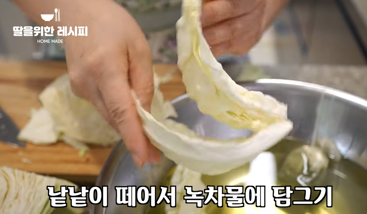큰 냄비에 배추를 먹기 좋은 크기로 썰어 겹겹이 건져내고 식초물이나 녹차물에 잠기도록 넣어주세요. 51분 후 흐르는 물에 깨끗이 헹구고 물기를 완전히 털어냅니다..