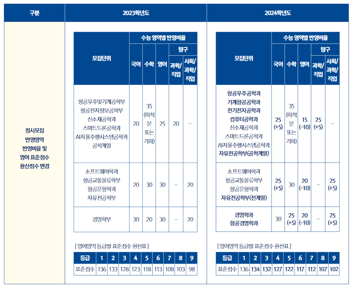 또한, 공과대학, AI융합대학, 스마트드론공학과, AI자율주행시스템공학과, 개방전공(공학적성) 학과에서는 수능분야별 반영비율이 전년도 대비 한국어는 5% 감소, 영어는 5% 증가, 영어(수학)는 5% 증가했습니다. 미적분/기하), 탐구(과탐) 등 필수과목이 폐지됩니다. 다만, 과점 과목당 5% 가산점이 신규 가산되며, 일부 모집 단위의 경우 모집군이 변경됩니다.